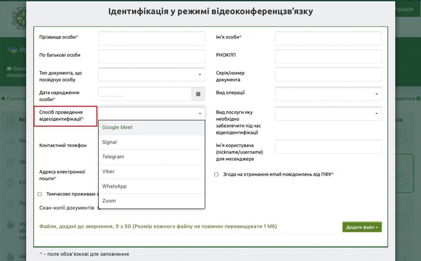- із випадаючого списку оберіть спосіб проведення відеоідентифікації через один із запропонованих додатків: Google Meet, Signal, Telegram, Viber, WhatsApp, Zoom;