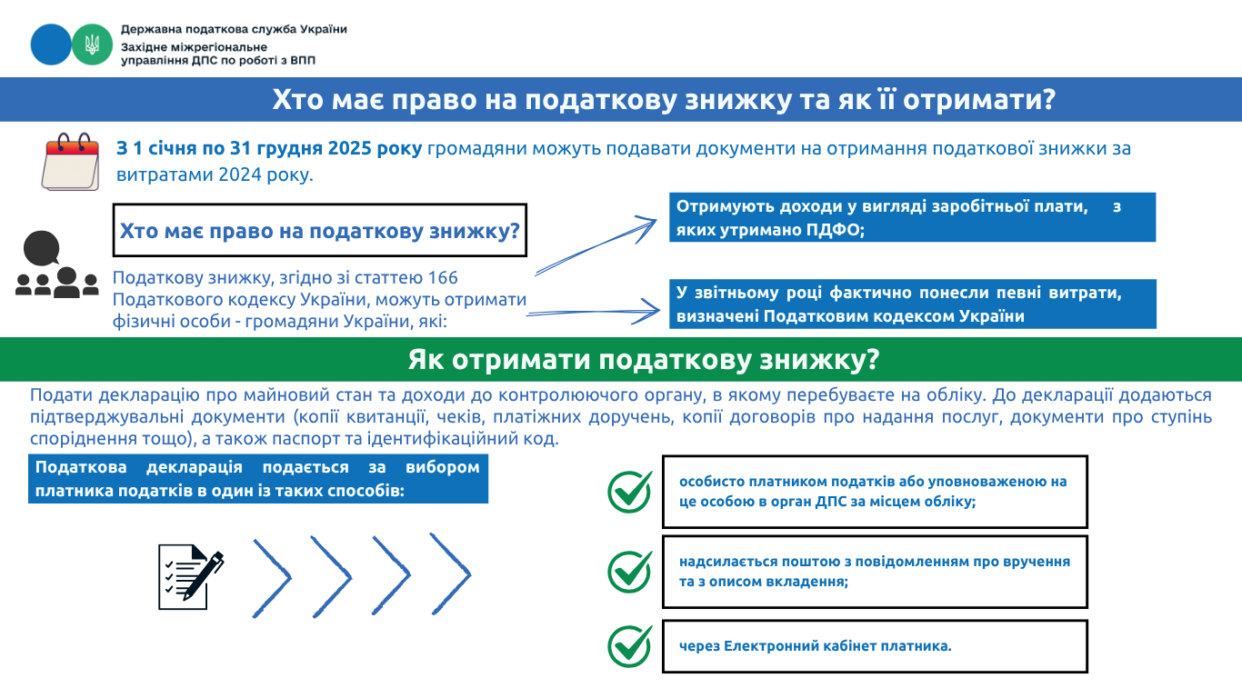 Нагадуємо: для отримання податкової знижки потрібно до 31 грудня подати податкову декларацію про майновий стан та доходи. Головна умова — отримувати офіційні доходи, з яких сплатили податок на доходи фізичних осіб (ПДФО).