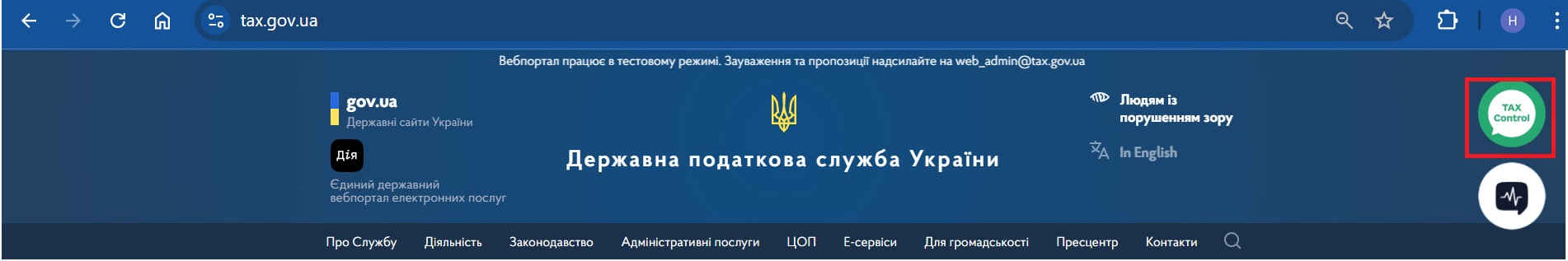 Віджет «ТAX Control» розміщений на вебпорталі ДПС у правому верхньому куті.